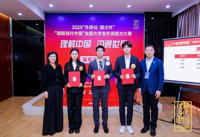 22级葡语专业硕士研究生肖以琦(中间)喜获2024“外研社·国才杯”“理解当代中国”全国大学生外语能力大赛葡语组金奖(冠军)