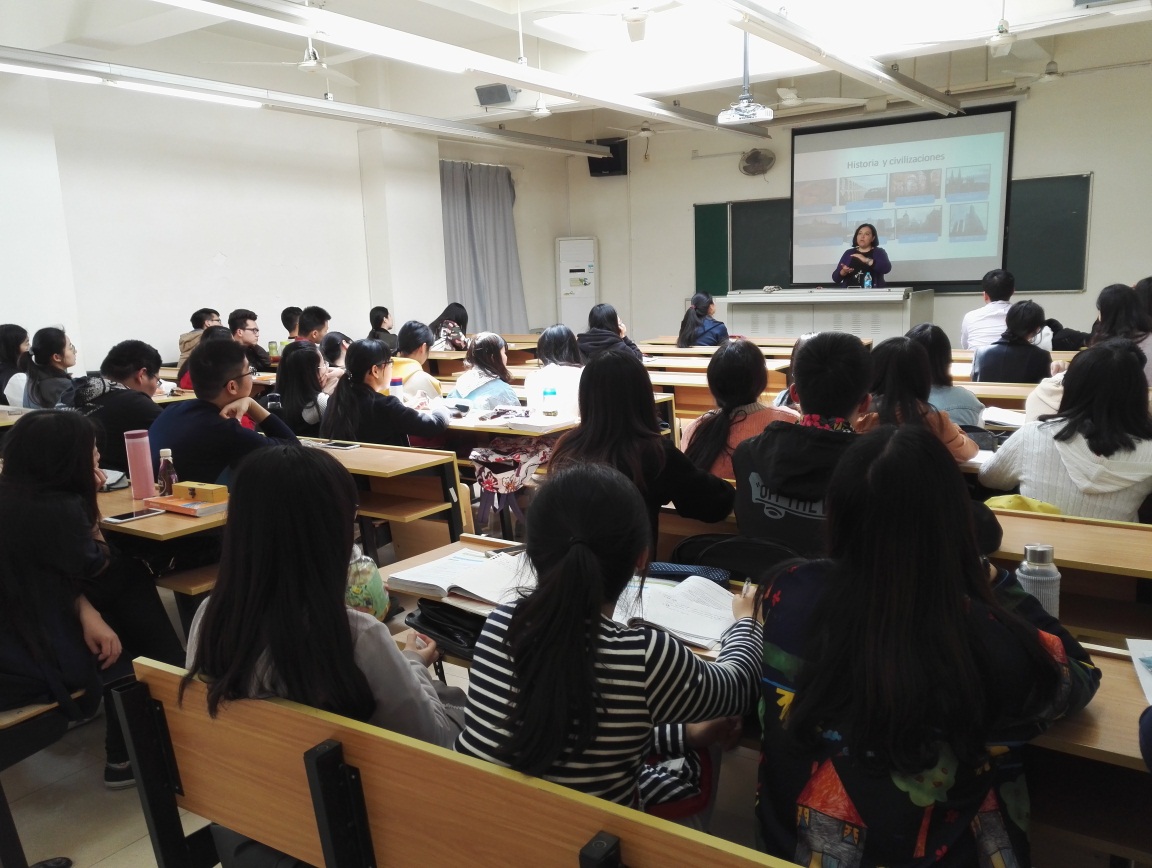 随后,Tamara Rodil Cuadrado女士进入西语文化课教室,与西班牙语专业二年级同学进行了有关中西文化差异的对话。她通过生动丰富的漫画展示,向同学们深入浅出地介绍了中西两国人民在思考、行为、表达等多方面的差异,并与同学们进行了热情积极的互动。