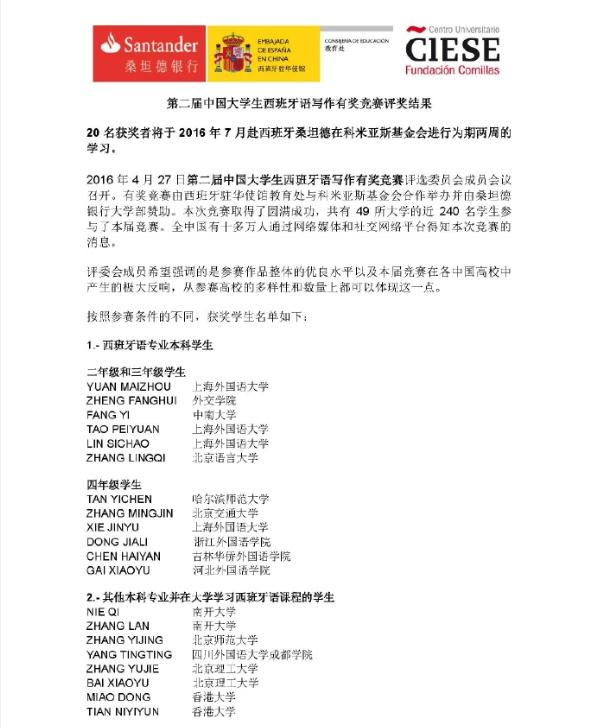 近日,为期三个月的第二届中国大学生西班牙语写作竞赛(以下简称“写作竞赛”)圆满落幕,西班牙驻华使馆教育处正式公布了评选结果,我校四名学生荣获最高奖,将获得牙桑坦德银行的资助,于今年暑期赴西班牙学习和交流。