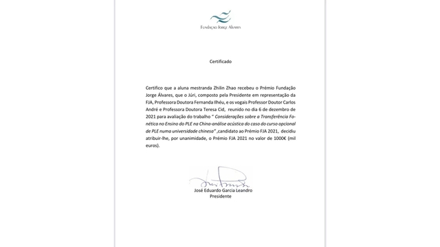欧维治基金会年度奖由欧维治基金会主办,旨在奖励有志于研究葡萄牙、中国内地与澳门特别行政区关系的中葡高校在读硕士生和博士生,增强其研究中葡关系的意愿,进一步促进两国在高等教育层面上的合作与交流。比赛设“葡萄牙语言和文化研究及其在亚洲的影响”及“关于中国与葡萄牙企业管理模式演变对比研究(兼容与合作)”两个研究方向,评审委员会由基金会理事与数位葡萄牙学术权威组成。此次赵知临的参赛论文题为《从声学分析角度浅谈葡语教学中的语音迁移现象——以中国某高校葡语选修课为例》,葡语教研室主任徐亦行担任其指导教师,评审委员会全票同意该篇论文获奖。