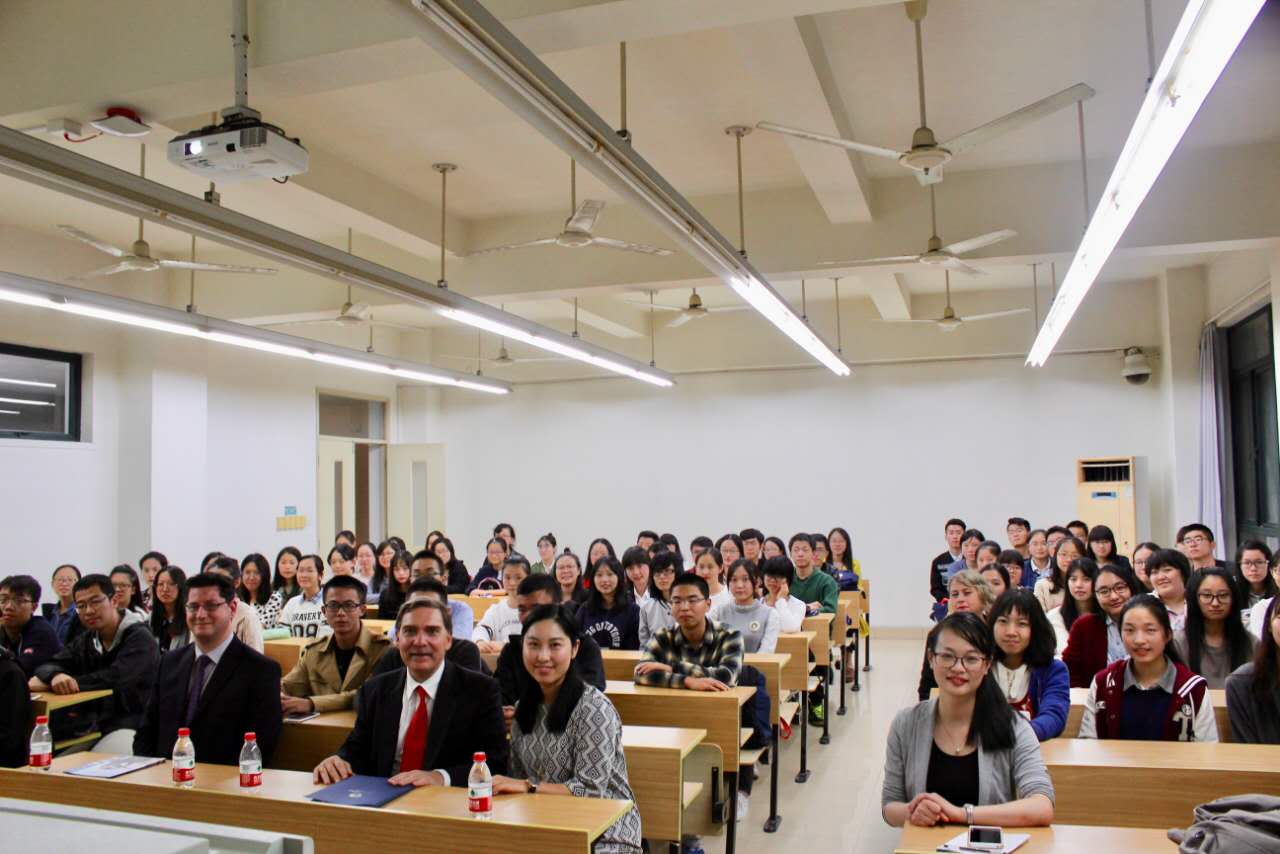 会谈后,罗卡纳斯大使来到西方语系,为师生作了一场题为“中希友谊:两国关系和未来前景”的英文讲座,深入介绍了两国在政治、经济、文化方面的合作与交流。他从中国人和希腊人的思维方式角度,分析了两国的哲学思想、生活方式及文化教育的相似之处。他指出,希腊和中国作为历史悠久的文明古国,两国文化历经几千年的进化与发展,同中存异,能够互相理解,有着天然的合作优势。大使还以中远集团收购希腊比雷埃夫斯港港务局股份为例,向师生们介绍了近年来中希两国在经贸领域的合作成果。最后,大使先生勉励同学们刻苦学习,多进行跨文化交流,为未来成为中国和希腊以及中国和世界的交流使者做好准备。通过讲座并和大使互动,在场的同学们都对自己作为卓越国际化人才的使命有了更深的理解,受益良多。