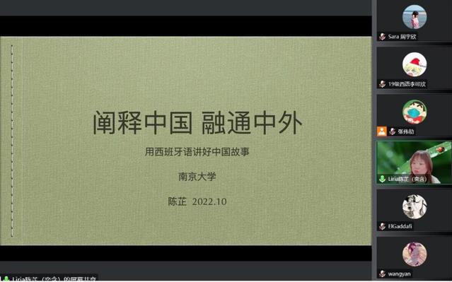 2022年10月20日晚,应南京大学外国语学院的邀请,上海外国语大学西方语系陈芷副教授做了题为“阐释中国,融通中外——用西班牙语讲好中国故事”的讲座。讲座由南京大学西班牙语系主任张伟劼副教授主持,共计200余名师生及西语爱好者参与其中。