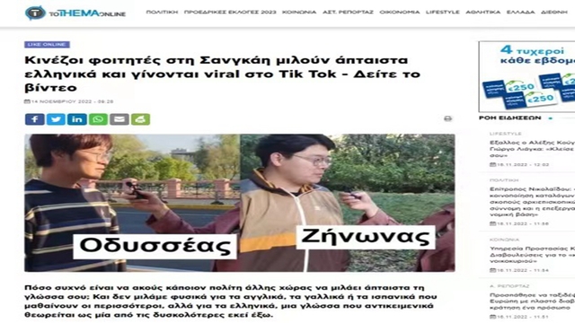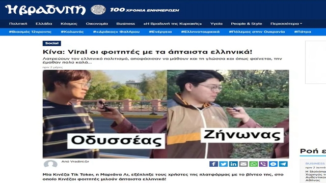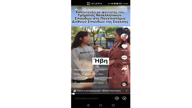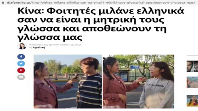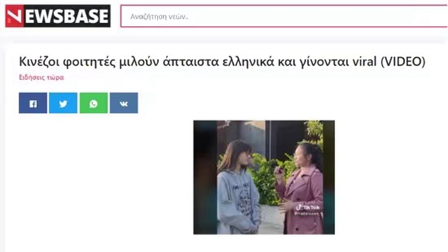 该街采视频在希腊抖音平台发布后,短短几日内播放量达到110万,点赞超过11万,评论近2000,转发超过4000。随后有超过30家希腊网络媒体对该视频进行了报道或转载,一时之间,中国学生说流利的希腊语成为全网讨论的热点。11月15日,该新闻荣登opentv当日最佳新闻。网友们看过视频后纷纷表示希腊语是世界上最难学的语言之一,但是“他们说得比希腊人还好”,“他们说话就像希腊人一样”,甚至有网友质疑“他们真的不是希腊人吗”?