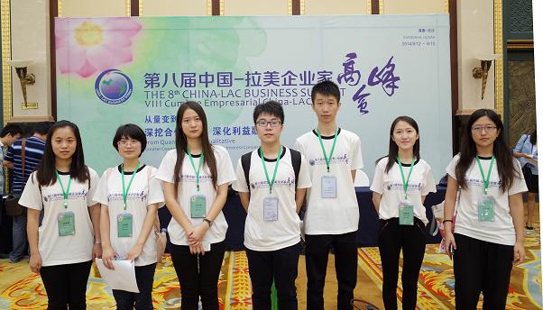 2014年9月12日至9月13日,第八届中国—拉美企业家高峰会在湖南长沙举行,全国政协副主席刘晓峰、湖南省委书记徐守盛等出席开幕式并发表演讲,来自近三十个拉美和加勒比国家及中国二十多个省市的八百余名企业家齐聚长沙。我校西方语系派出8名西班牙语志愿者进行翻译工作,陪同拉丁美洲多国部长、大使及参赞等贵宾与会,并积极投身企业洽谈会协助中拉企业沟通,圆满完成任务。