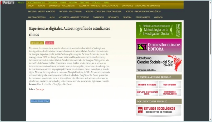 近日,由我系多名西班牙语专业研究生共同完成的学术调研报告《基于互联网使用经历的自我民族志研究》(Experiencias digitales. Autoetnografías de estudiantes chinos)被收录于“社会学研究中心(Centro de Investigaciones y Estudios Sociológicos,简称CIES)”的论文集中,这是我系区域国别拉丁美洲研究的重要实践成果。