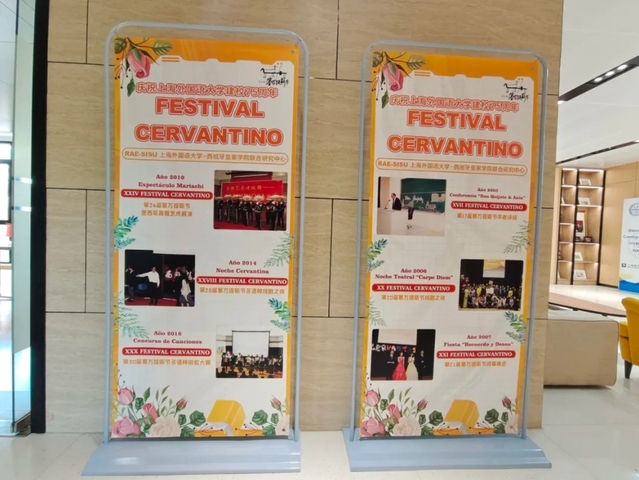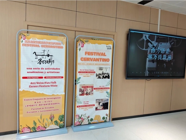 2024年4月至6月,为庆祝上海外国语大学建校75周年,上海外国语大学-西班牙皇家学院联合研究中心(以下简称RAE-SISU联合研究中心)举办 “塞万提斯节图片展”活动。展览分为珍贵老照片和文创海报两部分,这场视觉盛宴吸引了多位外国友人和校内师生前来参观。