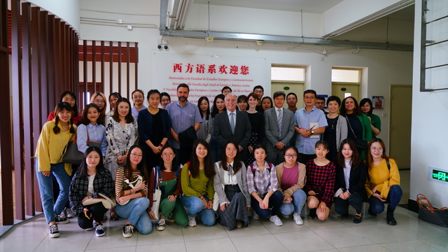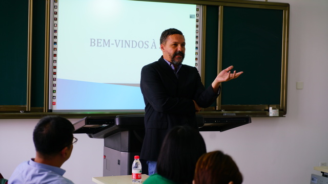 2019年10月14日上午,巴西作家保罗·斯科特(Paulo Scott)到访上海外国语大学松江校区,为葡萄牙语专业师生开设讲座。巴西驻沪总领事乐思哲(Gilberto Fonseca Guimarães de Moura)、副总领事马安文(MárioAntoniode Araújo)随同前来,西方语系葡语教研室主任徐亦行,巴西研究中心主任、葡语教研室副主任张维琪及葡语专业师生参与接待。在致辞中,乐思哲谈到了中国与巴西在社会及文化方面的相似之处,他说,正是这些共通点增进了中巴两国的相互理解,促进两国在金砖(BRICS)框架内外的多领域合作。此外,他还重申教育的重要性,肯定了两国教育部门和机构为中巴两国友好交往做出的贡献。马安文简要介绍了本次活动的背景:保罗·斯科特此次访华之行由上海作家协会牵头,旨在开展中国作家与拉美各国作家间的友好交流。