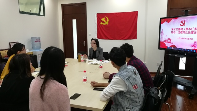 2019年10月15日中午,西方语系在松江校区3400室举行“不忘初心,牢记使命”主题教育集中研讨学习。本次集中学习围绕“深化立德树人根本任务,推动一流教师队伍建设”主题展开,上海外国语大学副校长张静与西方语系党政班子全体成员共同参与学习。西方语系党总支书记忻炯俊领学,带领全体班子成员从总体上解读了《深入学习习近平关于教育的重要论述》的主要精神。系主任于漫、副系主任杨明、党总支副书记张敏、办公室主任赖小婵结合实际工作,分别围绕如何立德树人、推进一流教师队伍建设进行研讨,交流学习感悟和体会。全体成员精读了《论述》第二章和第九章,对照习近平总书记关于教育的重要论述的科学内涵和精神实质,围绕各自分管的党建工作、思政工作以及教师队伍建设等相关工作进行了深入思考和现场交流,张静副校长参与讨论并给予指导。本次集体学习基本达到了“原原本本读,带着问题学,结合工作谈,领导具体提”的学习效果。